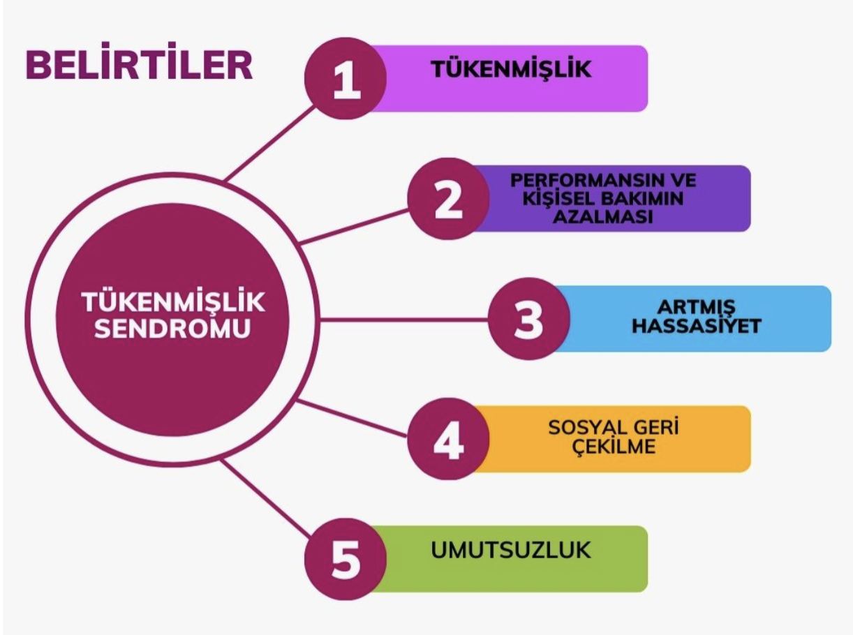 Tükenmişlik, duygusal olarak tükenme, duyarsızlaşma ve bunların ardından gelen düşük kişisel başarı belirtilerinden oluşur.